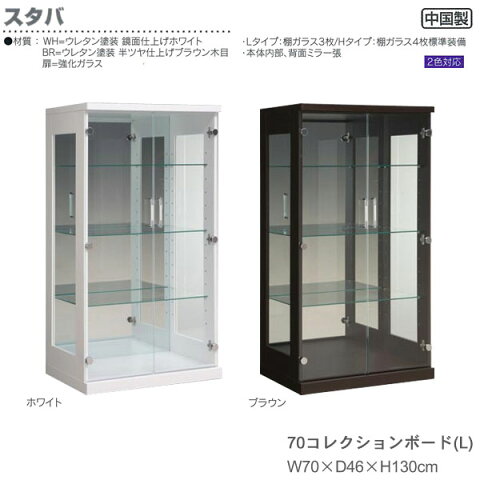 ■■こちらをクリック_※ご注文からお届けまで■■【開梱設置・送料無料】 品名 「スタバ」 コレクションボード(L) ロータイプ 幅70cm 高さ130cm 2色対応 キュリオケース フィギュアケース 飾り棚 材質 WH:ウレタン塗装 鏡面仕上げホワイト BR:ウレタン塗装 半ツヤ仕上げブラウン木目 扉:強化ガラス サイズ W70×D46×H130cm 仕様 ・棚ガラス3枚標準装備(追加オーダーできます) ・本体内部、背面ミラー張 カラー ホワイト/ブラウン オプション販売 LEDダウンライト:5480円(1本) 棚ガラス:2330円(1枚) ※別途料金は発生しますが、下記項目選択肢情報から選択して下さい。