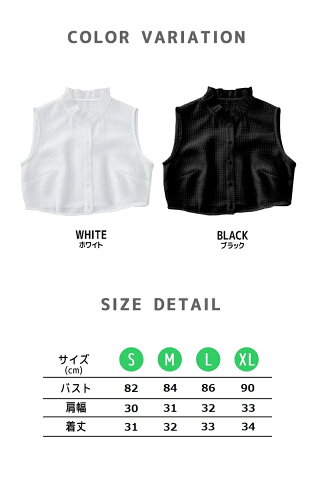 商品情報素材/材質ポリエステルサイズ/寸法 S:バスト82cm、肩幅30cm、着丈31cmM:バスト84cm、肩幅31cm、着丈32cmL:バスト86cm、肩幅32cm、着丈33cmXL:バスト90cm、肩幅33cm、着丈34cmその他商品説明ニットやカーデガンにINするだけでコーデの幅が広がるフリルタイプの付け襟。
